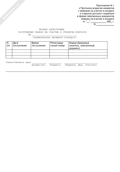 - 678Журнал регистрации поступления заявок на участие в открытом конкурсе (приложение к протоколу вскрытия конвертов с заявками на участие в открытом конкурсе и открытия доступа к поданным в форме электронных документов заявкам на участие в открытом конкурсе на размещение заказов на поставку топографо-геодезической и картографической продукции, выполнение топографо-геодезических и картографических работ, оказание услуг для федеральных государственных нужд Федерального агентства геодезии и картографии)