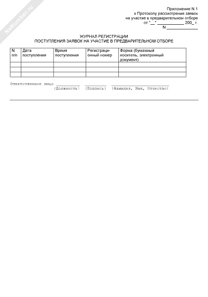 - 680Журнал регистрации поступления заявок на участие в предварительном отборе (приложение к протоколу рассмотрения заявок на участие в предварительном отборе в целях составления перечня поставщиков для размещения у них заказа на поставки продукции, выполнение работ, оказание услуг, необходимых для оказания гуманитарной помощи либо ликвидации последствий чрезвычайных ситуаций природного или техногенного характера)