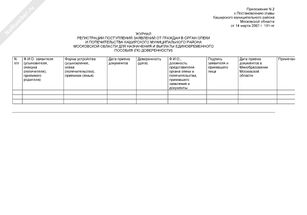 - 719Журнал регистрации поступления заявлений от граждан в орган опеки и попечительства каширского муниципального района Московской области для назначения и выплаты единовременного пособия (по доверенности)