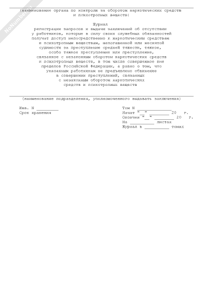 - 740Журнал регистрации запросов и выдачи заключений об отсутствии у работника, который получит доступ непосредственно к наркотическим средствам и психотропным веществам, непогашенной или неснятой судимости за преступление средней тяжести, тяжкое, особо тяжкое преступление или преступление, связанное с незаконным оборотом наркотических средств и психотропных веществ, в том числе совершенное вне пределов Российской Федерации