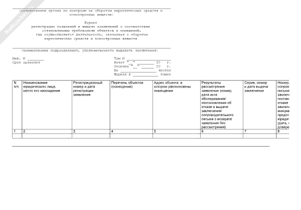 - 739Журнал регистрации заявлений и выдачи заключений о соответствии установленным требованиям объектов и помещений, где осуществляется деятельность, связанная с оборотом наркотических средств и психотропных веществ