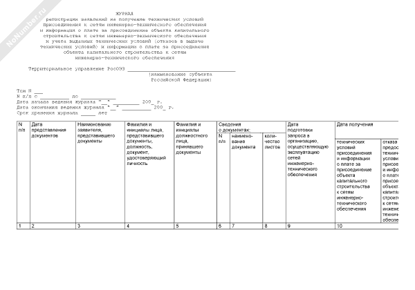 - 743Журнал регистрации заявлений на получение технических условий присоединения к сетям инженерно-технического обеспечения и информации о плате за присоединение объекта капитального строительства к сетям инженерно-технического обеспечения и учета выданных технических условий (отказов в выдаче технических условий) и информации о плате за присоединение объекта капитального строительства к сетям инженерно-технического обеспечения
