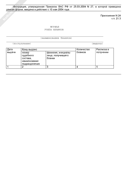 - 928Журнал учета бланков организационно-распорядительных документов арбитражного суда Российской Федерации (первой, апелляционной и кассационной инстанциях), исполнительных листов, удостоверений личности, командировочных удостоверений, трудовых книжек и иных документов