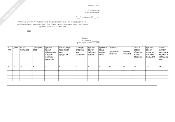 - 934Журнал учета больных или подозрительных на инфекционное заболевание, выявленных при санитарно-карантинном контроле транспортного средства. Форма № У-4