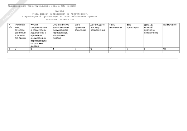 - 1025Журнал учета выдачи направлений на приобретение проездных документов лицам, получившим свидетельство о рассмотрении ходатайства о признании беженцем на территории Российской Федерации по существу, и беженцам в обеспечении проезда и провоза багажа к месту пребывания