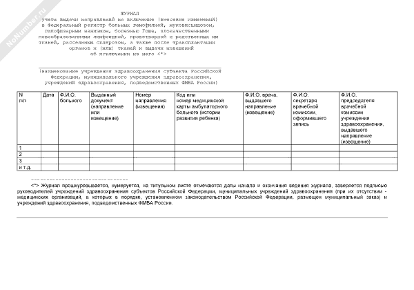 - 1021Журнал учета выдачи направлений на включение (внесение изменений) в Федеральный регистр больных гемофилией, муковисцидозом, гипофизарным нанизмом, болезнью Гоше, злокачественными новообразованиями лимфоидной, кроветворной и родственных им тканей, рассеянным склерозом, а также после трансплантации органов и (или) тканей и выдачи извещений об исключении из него. Форма № 03-ФР