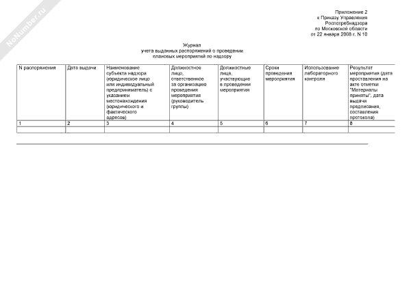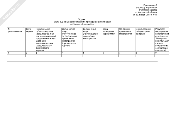 - 1029Журнал учета выданных распоряжений о проведении внеплановых мероприятий по надзору в установленной сфере деятельности за юридическим лицом и индивидуальным предпринимателем по Московской области