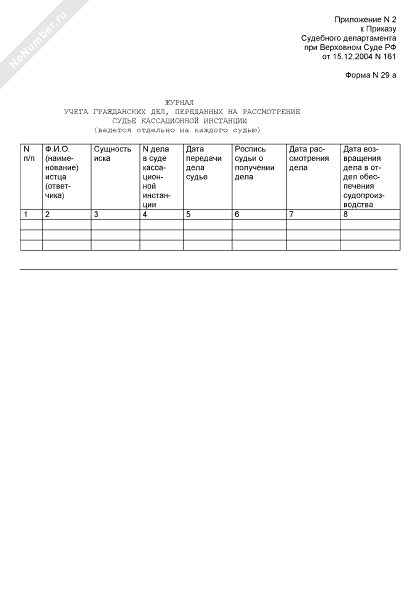 - 1054Журнал учета гражданских дел, переданных на рассмотрение судье кассационной инстанции (ведется отдельно на каждого судью). Форма № 29 а