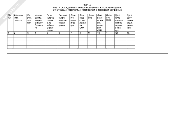 - 1405Журнал учета осужденных, представленных к освобождению от отбывания наказания в связи с тяжелой болезнью. Форма № 035-2/У-И
