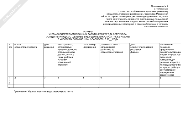 - 1407Журнал учета освидетельствованных работников города Серпухова Московской области, осуществляющих отдельные виды деятельности, а также работы в условиях повышенной опасности