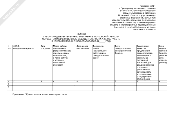 - 1404Журнал учета освидетельствованных работников Московской области, осуществляющих отдельные виды деятельности, а также работы в условиях повышенной опасности