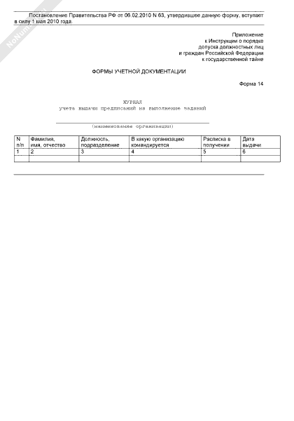 Формы учетной документации, необходимой для допуска должностных лиц и граждан Российской Федерации к государственной тайне. Журнал учета выдачи предписаний на выполнение заданий (форма № 14)