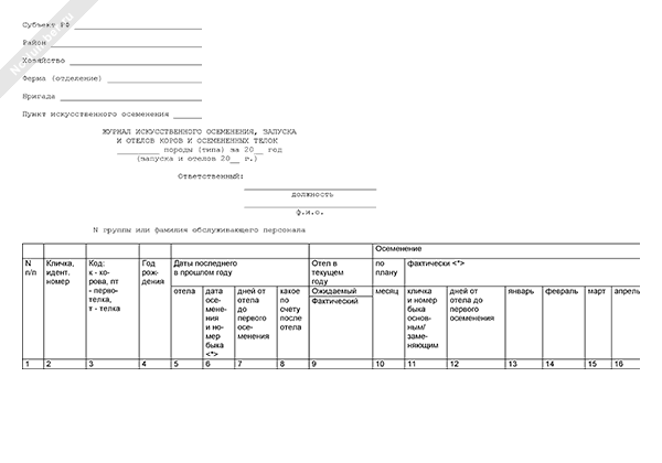 Журнал искусственного осеменения, запуска и отелов коров и осемененных телок (рекомендуемый образец заполнения)