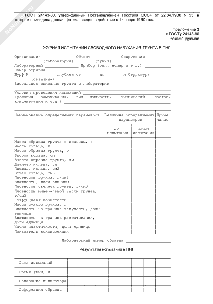 Журнал испытаний свободного набухания грунта в приборах для определения свободного набухания грунтов (рекомендуемая форма)