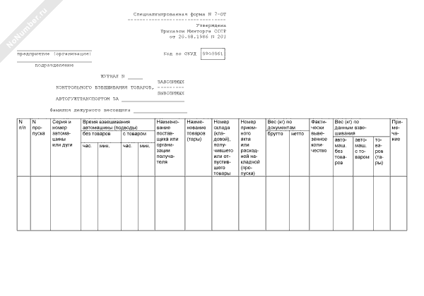 Журнал контрольного взвешивания товаров, завозимых (вывозимых) автогужтранспортом. Специализированная форма № 7-ОТ
