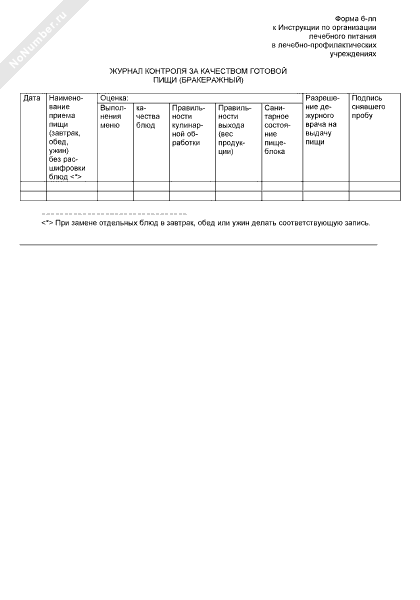 Журнал контроля за качеством готовой пищи (бракеражный). Форма № 6-ЛП