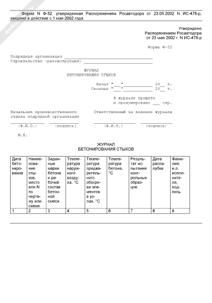 Журнал бетонирования стыков. Форма № Ф-52