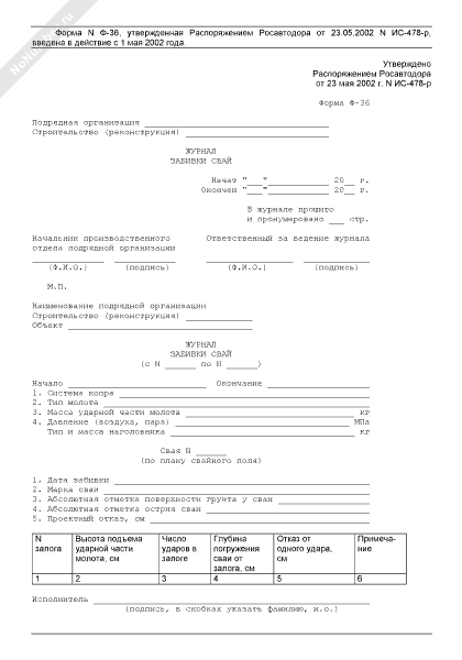 Журнал забивки свай. Форма № Ф-36