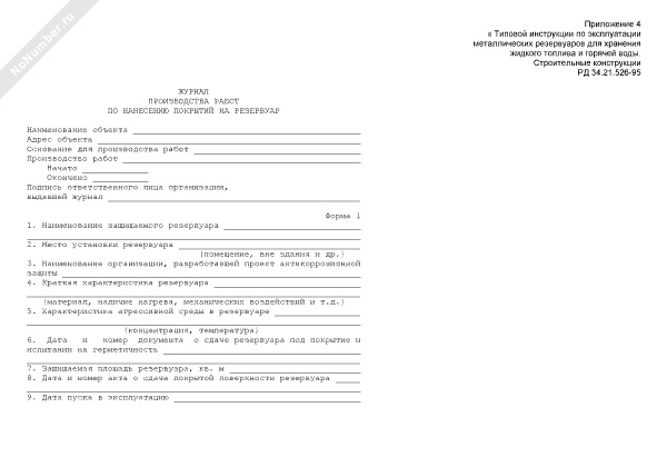 Журнал производства работ по нанесению покрытий на резервуар (рекомендуемый образец заполнения)