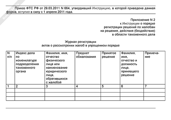 - Источник– Приказ ФТС РФ от 29.03.2011 № 664
