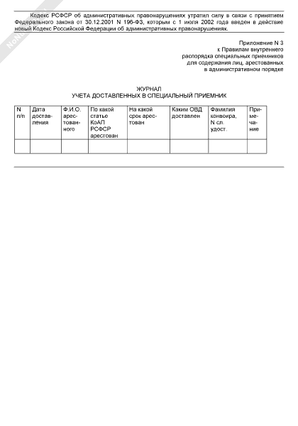 Журнал учета доставленных в специальный приемник