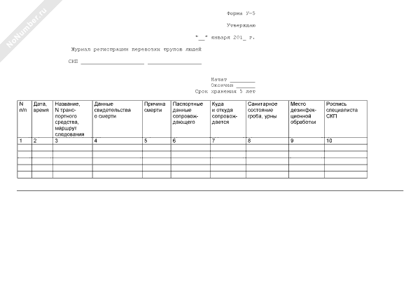 Журнал регистрации перевозки трупов людей. Форма № У-5 (рекомендуемый образец заполнения)
