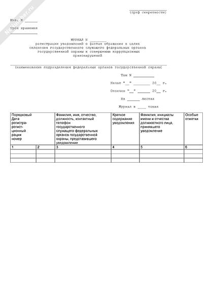 Журнал регистрации уведомлений о фактах обращения в целях склонения государственного служащего федеральных органов государственной охраны к совершению коррупционных правонарушений (рекомендуемый образец заполнения)