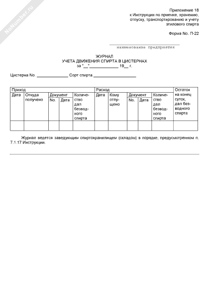 Журнал учета движения спирта в цистернах. Форма № П-22