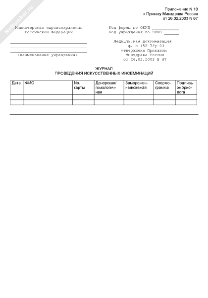 Журнал проведения искусственных инсеминаций. Форма № 158-7/у-03
