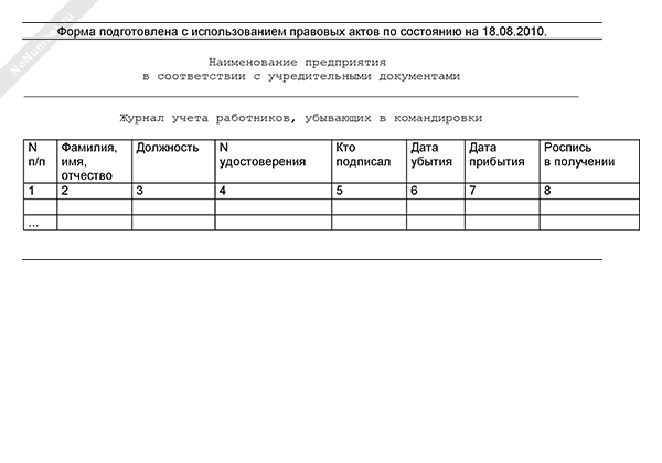 Журнал учета работников, убывающих в командировки (рекомендуемый образец заполнения)