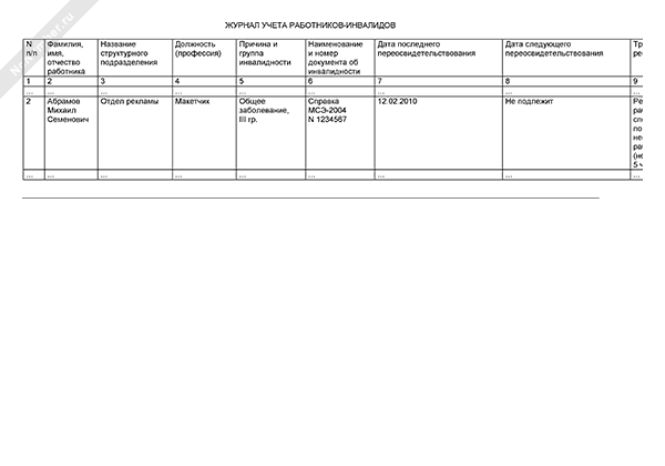 Журнал учета работников-инвалидов в организации (рекомендуемый образец заполнения)