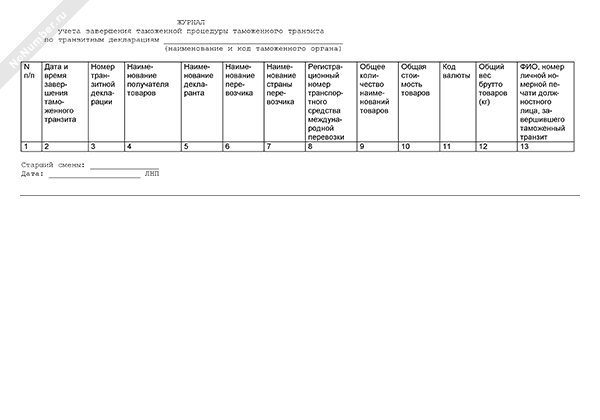 Журнал учета завершения таможенной процедуры таможенного транзита по транзитным декларациям (рекомендуемый образец заполнения)